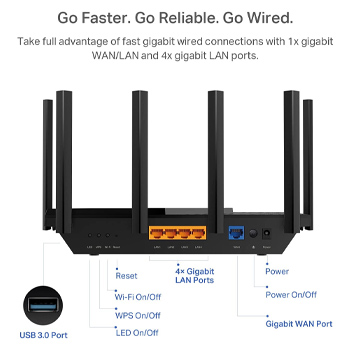 Full Featured WiFi 6 Router– Equipped with 4T4R and HE160 technologies on the 5 GHz band to enable max 4.8 Gbps ultra-fast connections.Power:12 V ⎓ 2.5 A