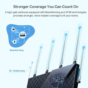 Extensive Coverage - Enjoy stable WiFi connections, even in the kitchen and bedroom. High-Power FEM, 6× Antennas, Beamforming, and 4T4R structures combine to adapt WiFi coverage to perfectly fit your home and concentrate signal strength towards your devices
